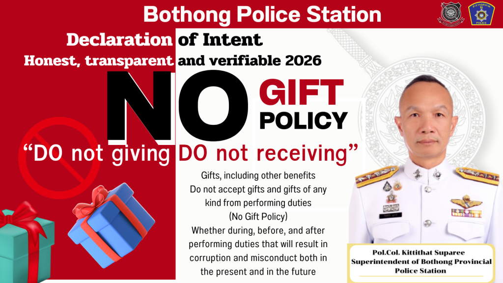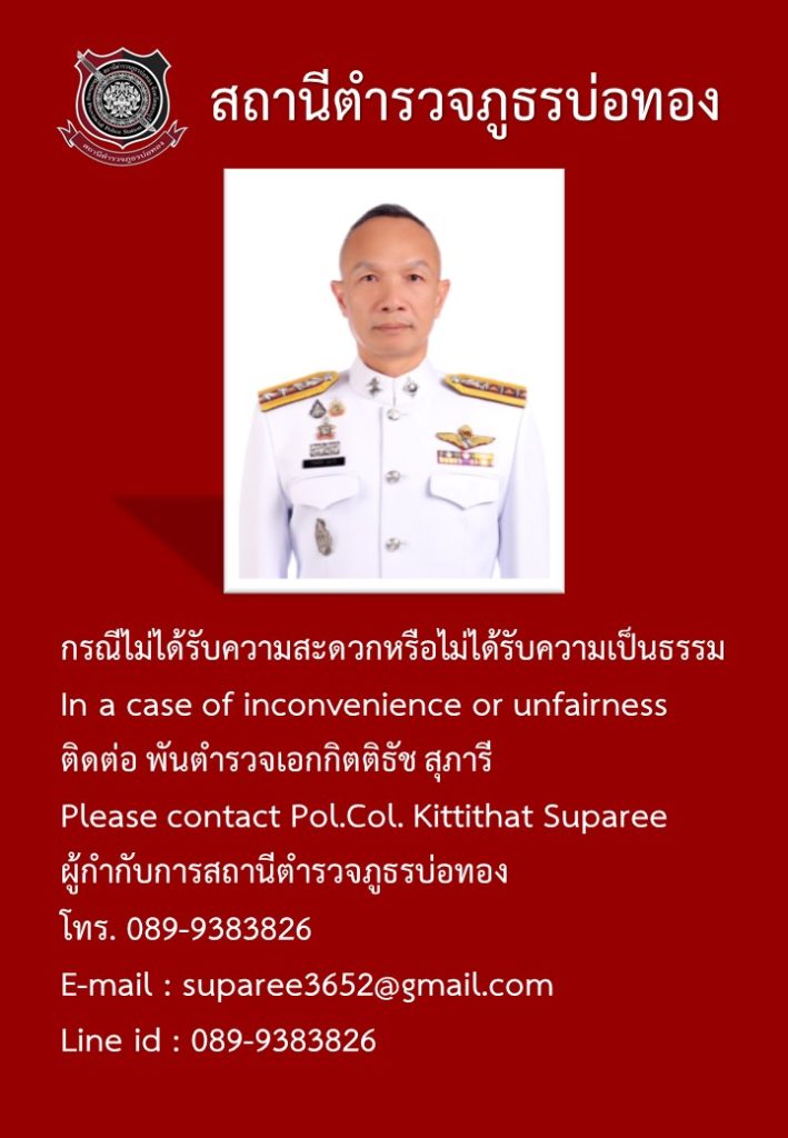 นโยบาย ผบ.ตร. สถานีตำรวจภูธรบ่อทอง ทำงานด้วยความโปร่งใส่ ภายใต้การอำนวยการของ ผู้กำกับการ พ.ต.อ.กิตติธัช สุภารี ผกก.สภ.บ่อทอง O19การมีส่วนร่วมของหัวหน้าสถานี การประเมินคุณธรรมและความโปร่งใสในการดำเนินงานของสถานีตำรวจภูธรบ่อทอง O6 การประชาสัมพันธ์ข้อมูลผลการดำเนินงาน ข่าวประชาสัมพันธ์ การปฏิบัติงานของสถานีตำรวจภูธรบ่อทอง ทาง facebook page ดูทั้งหมด ประกาศจัดซื้อจัดจ้างของสถานีตำรวจภูธรบ่อทอง ช่องทางติดตามข่าวสารผ่าน Fanpage Facebook O7 รายงานผลการปฏิบัติราชการ รายงานผลการปฏิบัติราชการ ต.ค.67 รายงานผลการปฏิบัติราชการ พ.ย.67 รายงานผลการปฏิบัติราชการ ธ.ค.67 รายงานผลการปฏิบัติราชการ ม.ค.68 รายงานผลการปฏิบัติราชการ ก.พ.68 รายงานผลการปฏิบัติราชการ มี.ค.68 O10 E-Service ระบบแจ้งความออนไลน์ คดีอาชญากรรมทางเทคโนโลยี ระบบเสียค่าปรับออนไลน์ e-Ticket ระบบการติดตามความคืบหน้าของคดีสำหรับประชาชน (Case Tracking) กรณีไม่ได้รับความสะดวกหรือไม่ได้รับความเป็นธรรม ต้องการร้องเรียน Name Email Message Send ช่องทางการรับฟังความคิดเห็น กำลังโหลด… ข้อมูลติดต่อ Facebook iconFacebookTwitter iconTwitterLINE iconLine